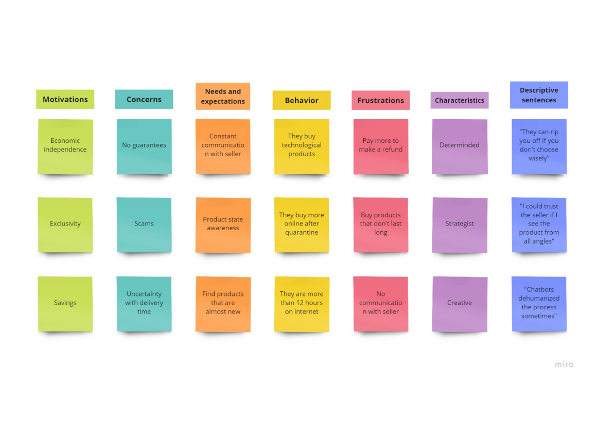 We made six interviews with people that liked to buy second handed products online. We needed to understand their mental models and their perspectives or motivations.